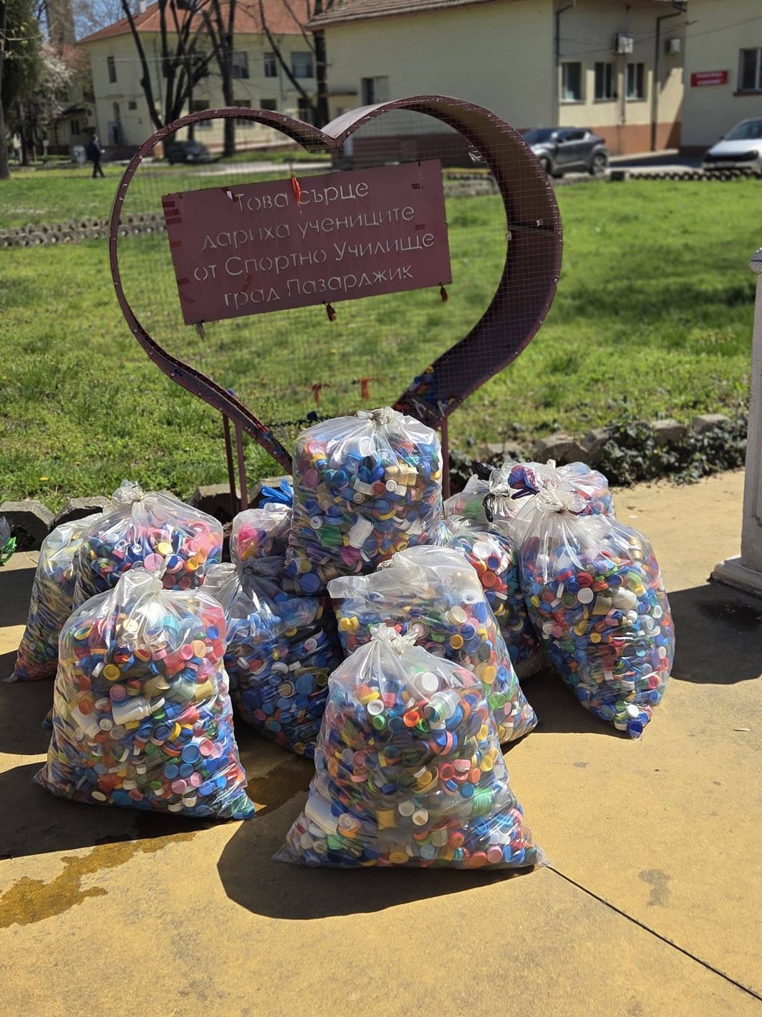 Голямото метално сърце в двора на МБАЛ-Пазарджик беше изпразнено броени дни преди Великден. През последните месеци в него са събрани 83,280 кг пластмасови капачки.