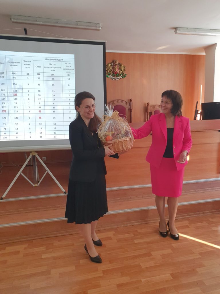 Съдия Сибила Симеонова поднесе поздравления от името на ръководството на Върховен административен съд за високите резултати по всички количествени и качествени критерии, постигнати от съдиите в Административен съд – Пазарджик при осъществяваната от тях правораздавателна дейност.
