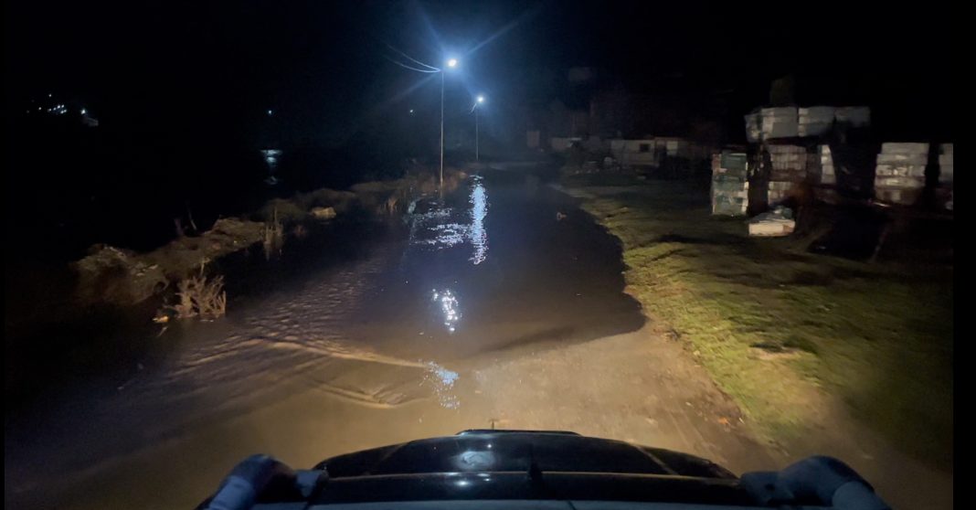 Част от улица в Драгиново вече е залята, след като нивото на реката се покачи рязко в резултат на интензивния валеж през деня. Водата е излязла извън коритото си в ниските участъци и е навлязла в уличната инфраструктура.