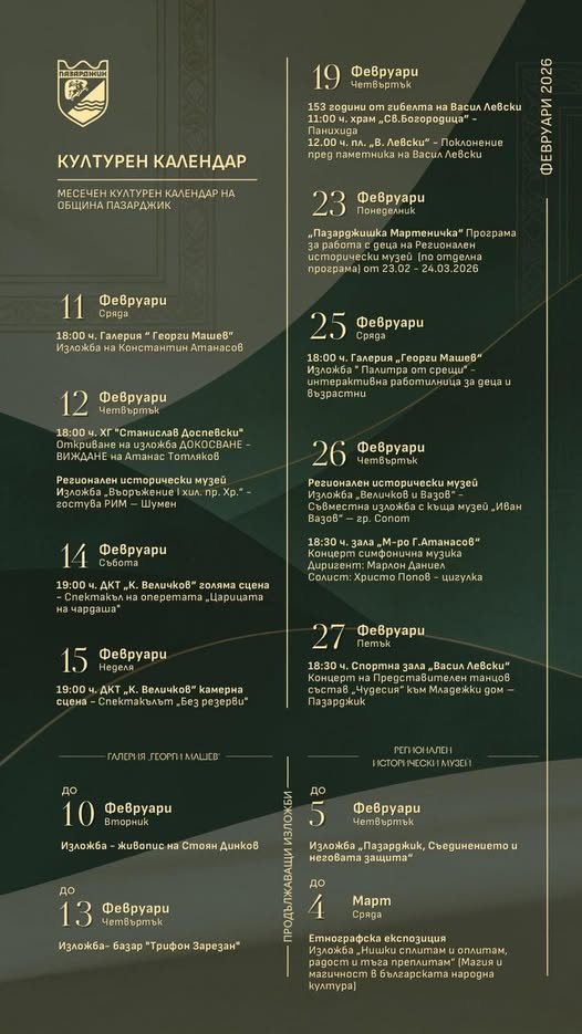 Община Пазарджик представя наситен културен календар за месец февруари, който включва театрални спектакли, изложби, концерти, образователни инициативи и събития, посветени на националната памет.