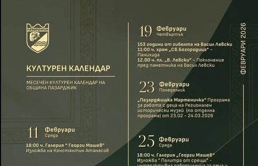 Община Пазарджик представя наситен културен календар за месец февруари, който включва театрални спектакли, изложби, концерти, образователни инициативи и събития, посветени на националната памет.