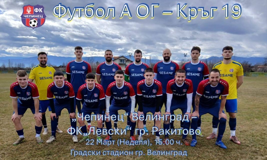 На 22 март 2026 г. (неделя) от 15:00 часа ФК „Чепинец“ – Велинград ще посрещне отбора на Левски (Ракитово) в среща от „А“ Областна група – Пазарджик. Двубоят ще се проведе на градския стадион.