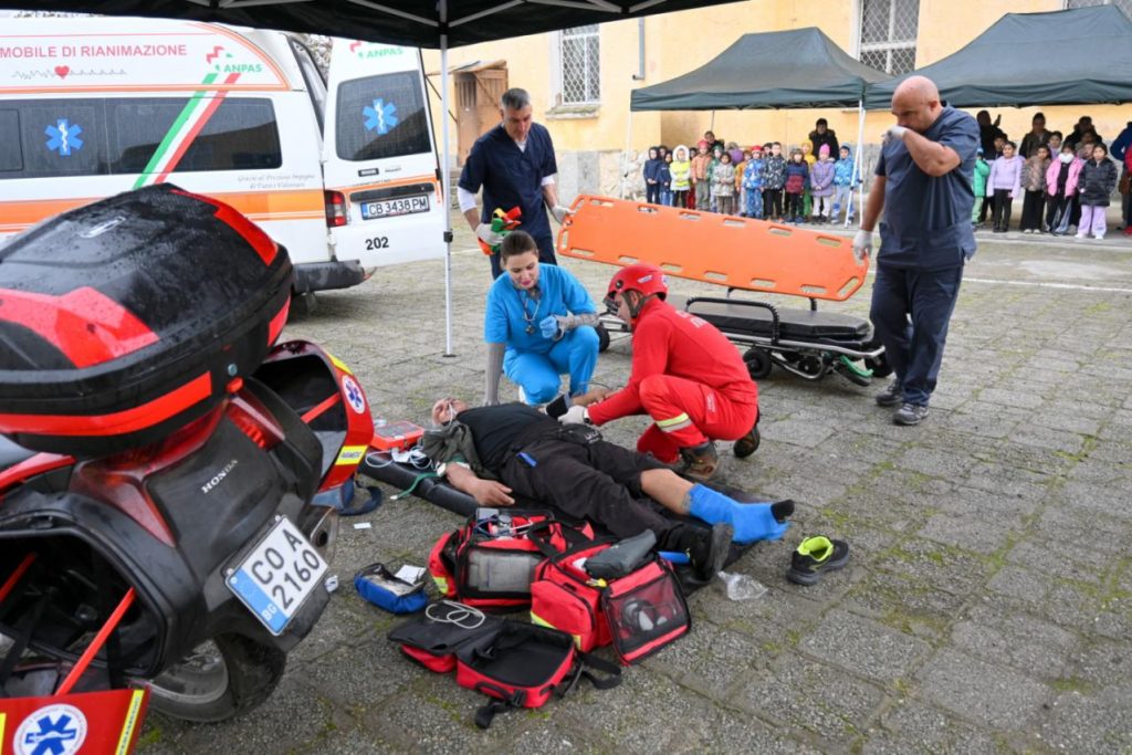 персонала на училището получава инфаркт и наранява крака си. Кметът на селото пристигна с мотора и демонстрира първоначалната помощ: сърдечен масаж с дефибрилатор, проверка на основни жизнени показатели – дишане,пулс, превръзка на раната, прехвърляне на пострадалия на твърда носилка с термо одеяло и транспортирането му до линейка, която да го отведе в болница. В демонстрацията взеха участие също доброволците Николай Александров, Величко Цеков и Ина Сталева.