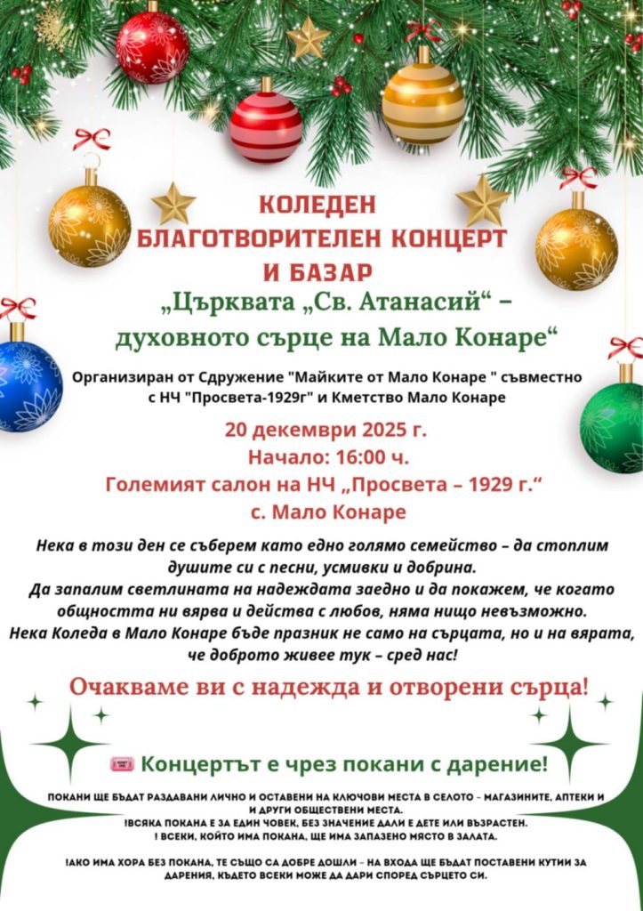 В навечерието на най-светлия християнски празник – Коледа, жителите на село Мало Конаре се обединяват около голяма и сърдечна кауза. На 20 декември 2025 г. от 16:00 ч. в големия салон на НЧ „Просвета – 1929 г.“ ще се проведе Коледен благотворителен концерт под надслов „Църквата „Св. Атанасий“ – духовното сърце на Мало Конаре“.