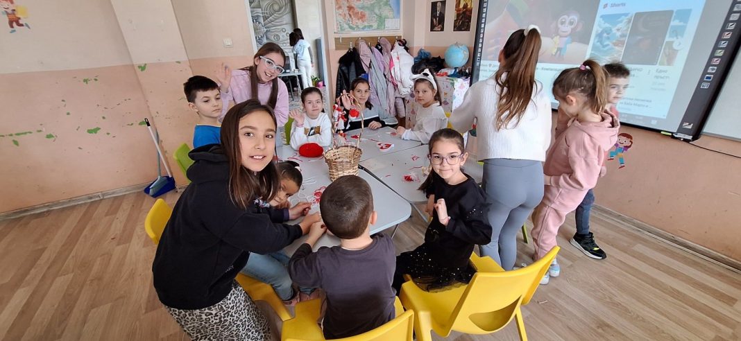 Учениците от 4. б клас посрещнаха малките гости с усмивки и ги поканиха да се включат в изработването на традиционни български мартеници. С бели и червени конци, малки и големи, заедно създадоха красиви символи на здравето и пролетта. Децата с радост разказваха за значението на Баба Марта и символиката на цветовете, като показаха завидни умения и творчество. Работилницата се превърна в истински празник на българските традиции.