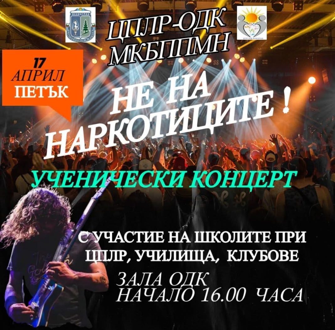 На 17 април (петък) ще се състои ученически концерт под надслов „Не на наркотиците!“, организиран от ЦПЛР-ОДК и МКБППМН. Събитието ще събере на една сцена ученици от различни училища, школи и клубове, които ще представят своя талант и ще отправят силно послание срещу употребата на наркотични вещества.