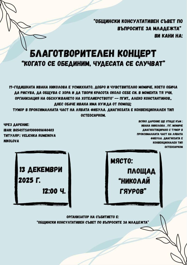 Велинград ще стане сцена на едно събитие, което обединява музика, съпричастност и надежда. Младежкият консултативен съвет по въпросите на младежта организира благотворителен концерт под надслов „Когато се обединим, чудесата се случват“, чиято цел е да събере средства за лечението на Ивана Николова – 17-годишно момиче, диагностицирано с тумор в проксималната част на лявата фибула, конвенционален тип остеосарком.