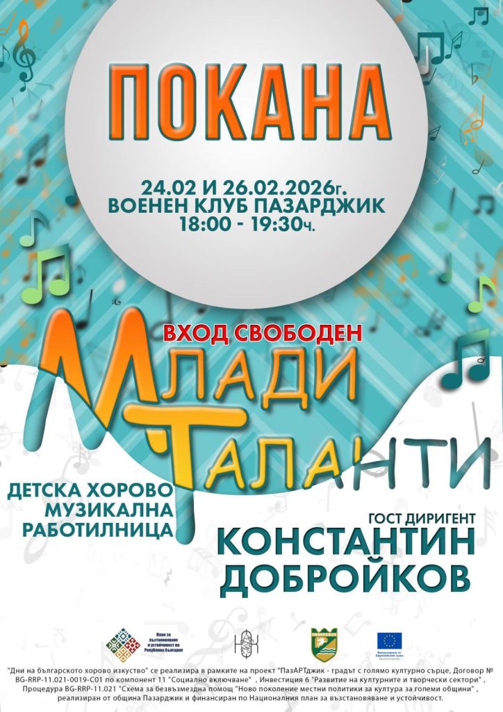 В работилницата ще се включат талантливи деца от хор „Слава Русева“ и ученици от музикалните паралелки при ОУ „Георги Брегов“ – град Пазарджик.