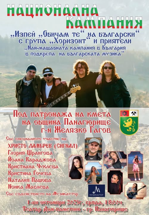 Община Панагюрище кани всички жители и гости на 01.10.2025 г. (сряда), от 18:00 ч., в Театър Дом-паметник на един незабравим спектакъл с култовата българска рок група „Хоризонт“ и приятели!