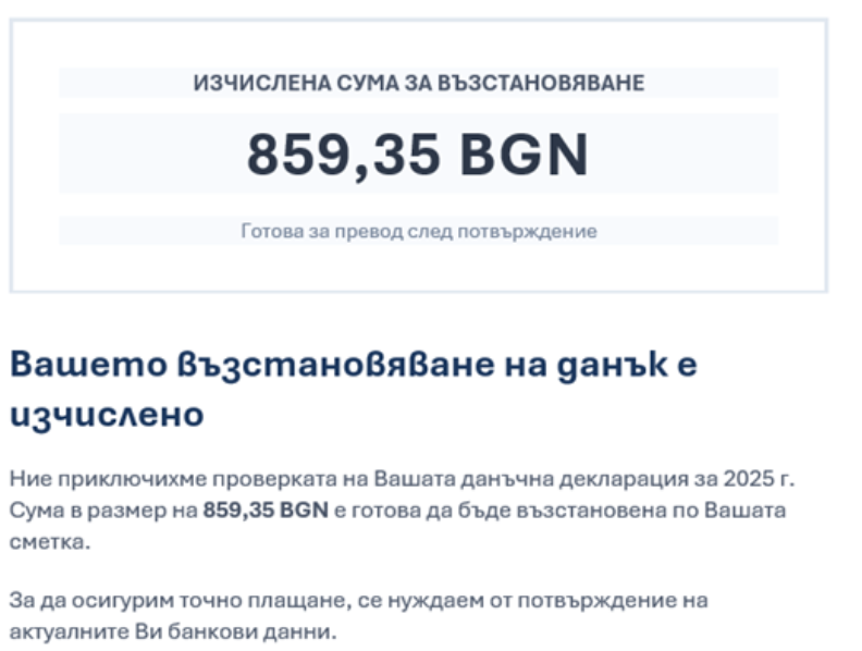 В съобщенията се посочва, че НАП са приключили проверката на съответната данъчна декларация за 2025 г., при което е установено, че има определена сума за възстановяване. Измамниците искали актуална банкова сметка за превеждане на парите.