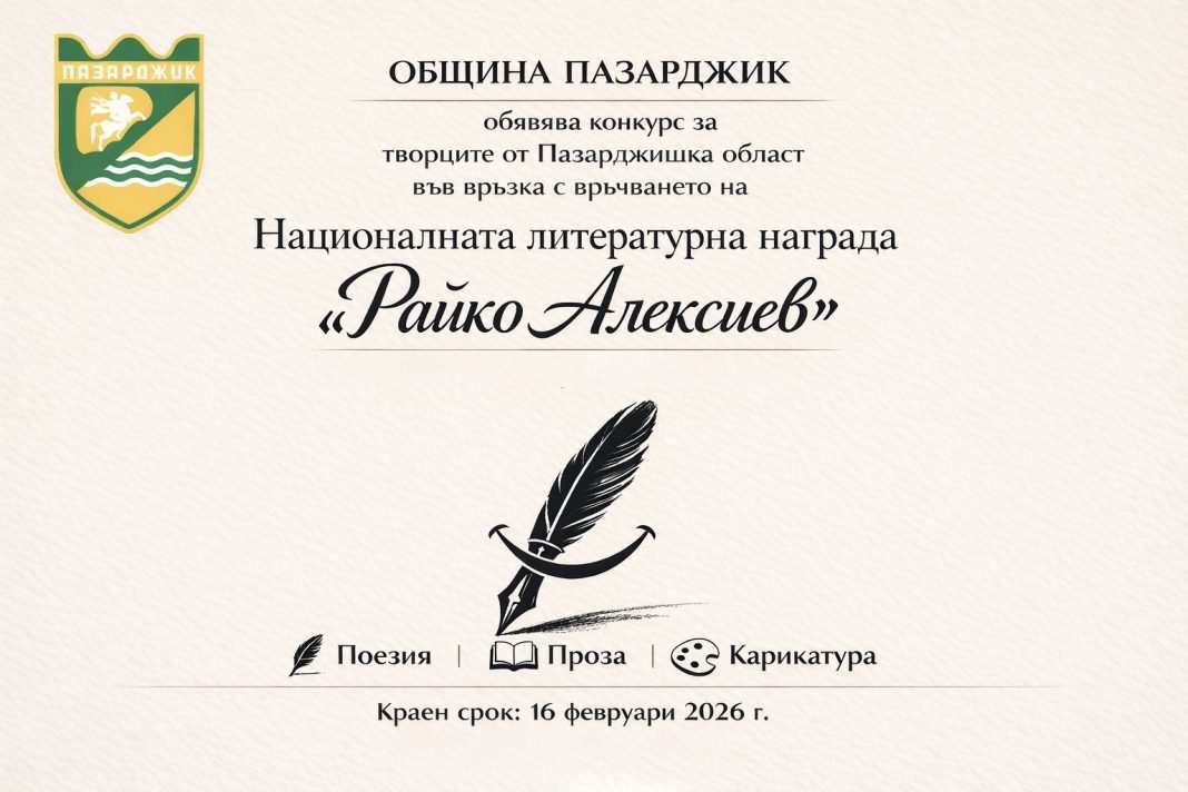 Във връзка с връчването на Националната литературна награда „Райко Алексиев“, Община Пазарджик обявява конкурс между творците от Пазарджишка област. Конкурсът се провежда за девети път и има за цел да насърчи съвременните прояви на хумора и сатирата в литературата и изобразителното изкуство и да отдаде почит на творческото наследство на Райко Алексиев.
