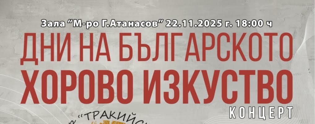 На 22 ноември 2025 г. от 18:00 ч. в зала „Маестро Г. Атанасов“ – Пазарджик ще се проведе празничният концерт „Дни на българското хорово изкуство“ – събитие, посветено на дългогодишната традиция и съвременните постижения в хоровото и ансамбловото музициране в региона. Входът е свободен.