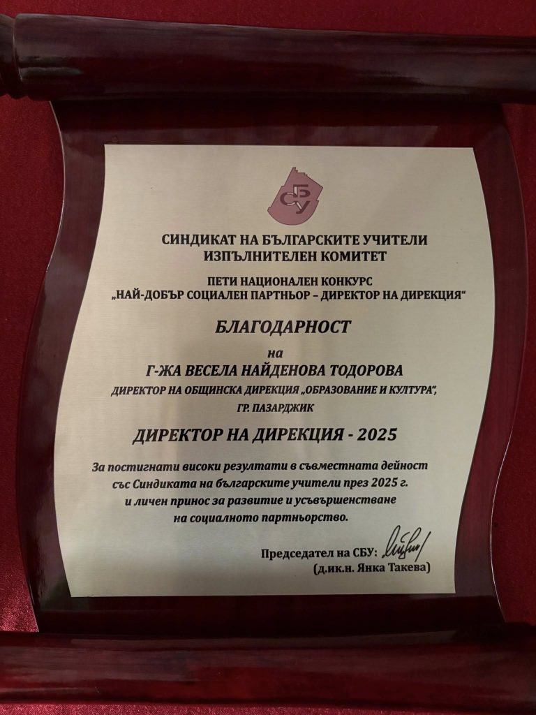 Директорът на дирекция „Образование и култура“ в Община Пазарджик Весела Тодорова е удостоена с наградата „Директор на дирекция- 2025“. Отличието се дава от Изпълнителния комитет на Синдиката на българските учители и й бе връчена от министъра на образованието и науката Красимир Вълчев.