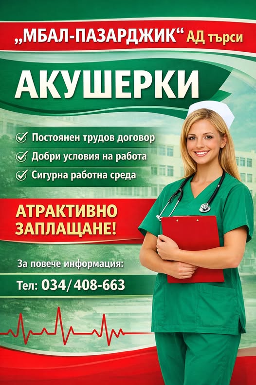 Акушеро-гинекологично отделение на „МБАЛ-Пазарджик“ АД обявява свободни работни места за акушерки.