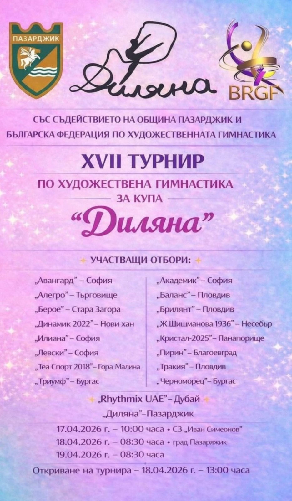 Седемнадесетият турнир по художествена гимнастика за купа „Диляна“ започва в Пазарджик в зала „Иван Симеонов“ на Зоната на здравето. Съорганизатори са Община Пазарджик и Българската федерация по художствена гимнастика. Участие са заявили 18 отбори.