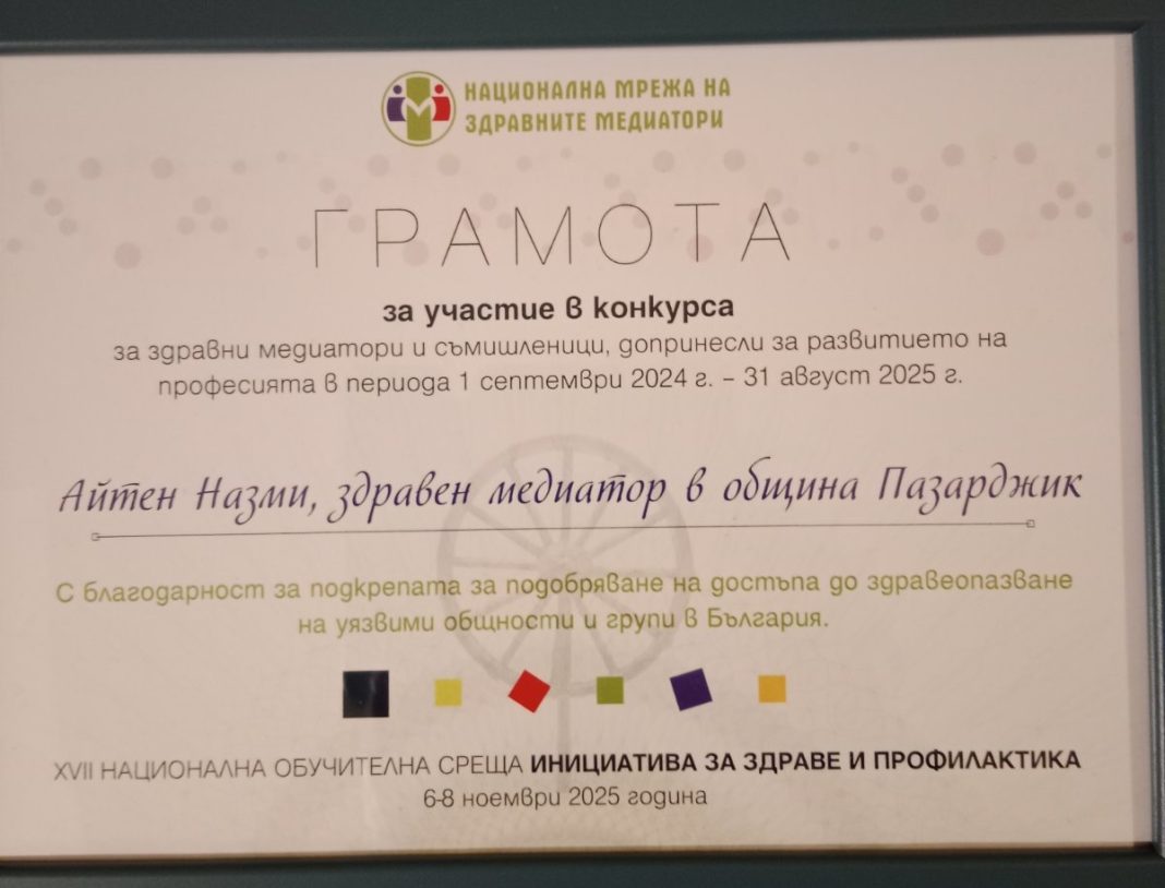 Айтен Назми Хюсеин – здравен медиатор към Община Пазарджик, беше отличена за втора поредна година на XVII Национална обучителна среща „Инициатива за здраве и профилактика“, проведена на 6, 7 и 8 ноември 2025 г. в София.